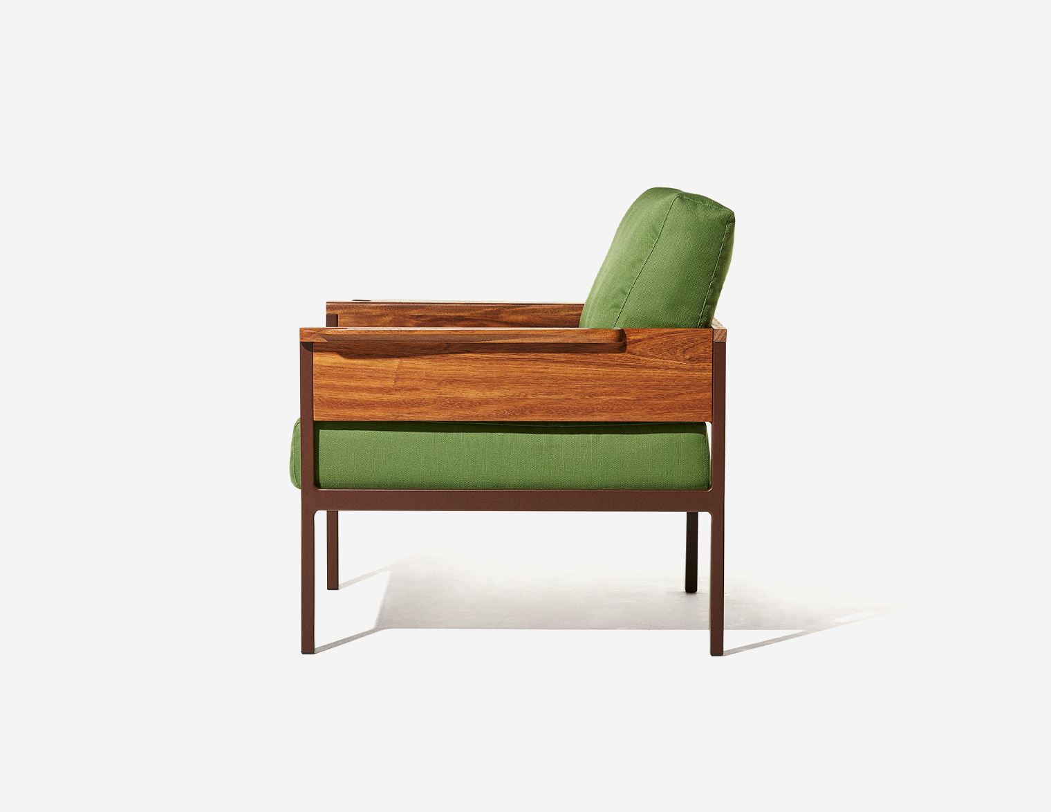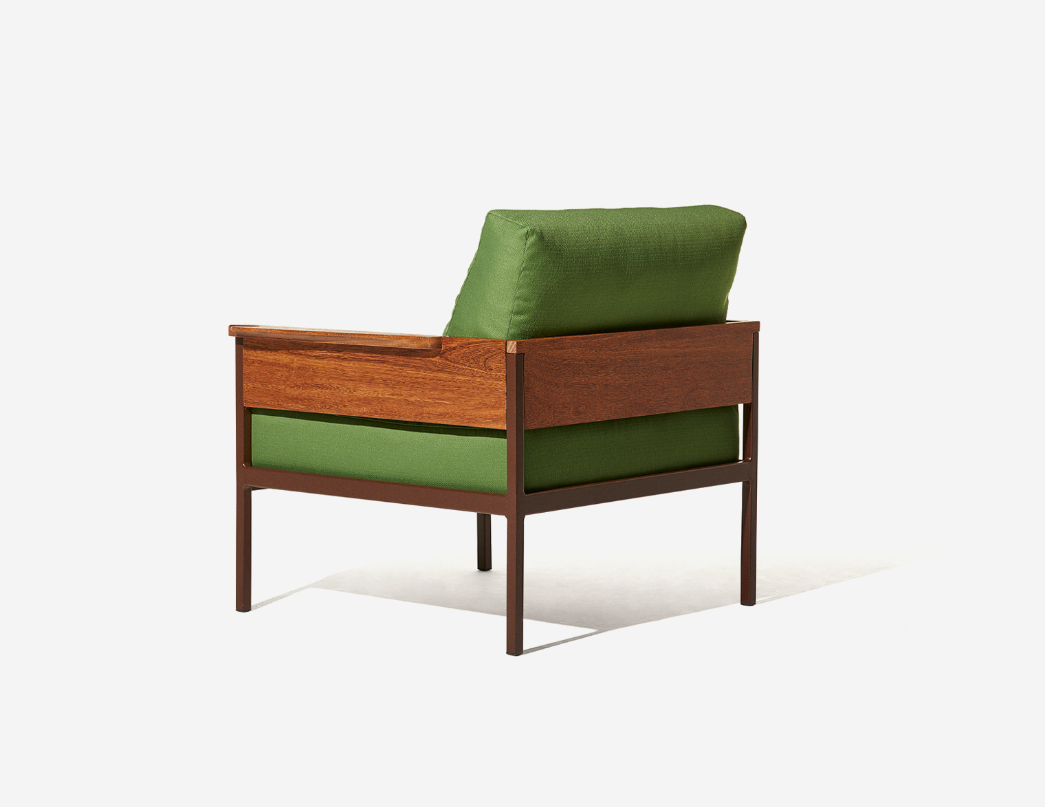 Estrutura em madeira, assento e encosto almofadados.